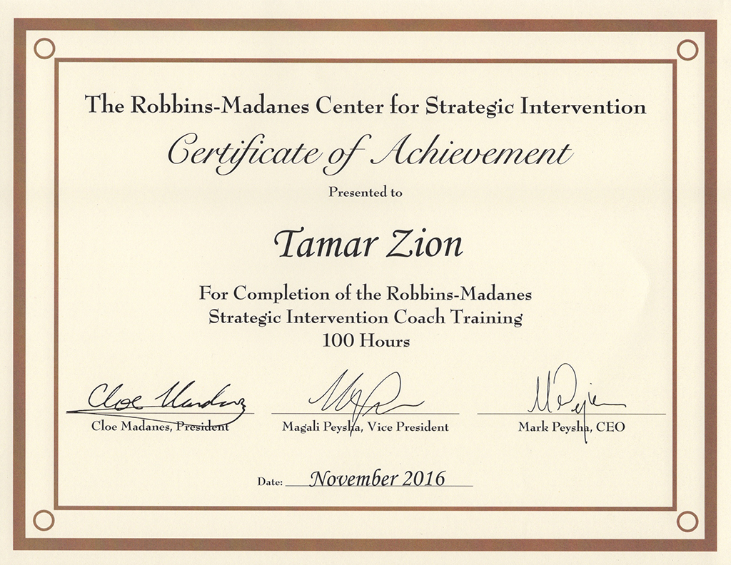 Coaching is second nature to Tamar and after a life long, soul-searching journey she became a certified Robbins-Madanes strategic intervention life coach, Numerologist, Personalisys practitioner, A Jack Canfield success principles transformation coach.